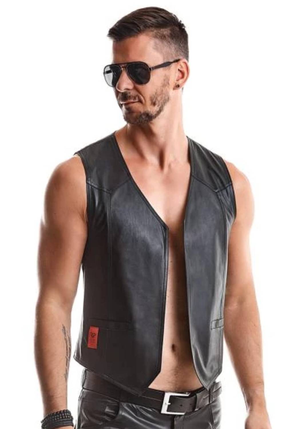 Diese moderne Herrenweste ist aus dehnbarem Wetlook-Material gefertigt und hat geometrische Steppnähte in Dreiecksform vorne oben. Hinten unten befindet sich ein funktionaler Verstellgurt mit dekorativer Metallschnalle. Auf der Vorderseite befindet sich ein dekorativer roter Alcantara-Patch mit dem RFP-Logo. Die passende Hose ist separat erhältlich. Hergestellt in der EU!