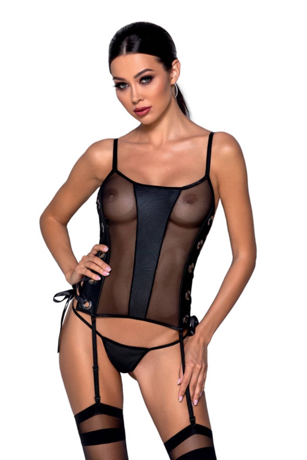 Dieses Korsett- und String-Set besteht aus mattem, dehnbarem Kunstleder und feinem Mesh, mit einer seitlichen Satinband-Schnürung. Die abnehmbaren Strumpfhalter und Strapse sind verstellbar. Ein passender T-String ist im Lieferumfang enthalten. Strümpfe können separat bestellt werden.