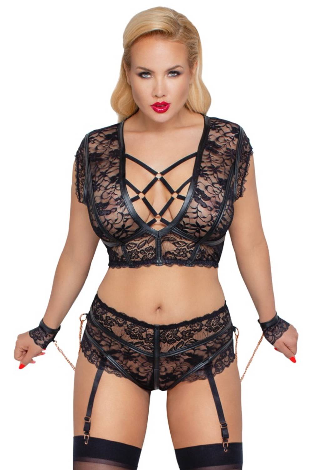 This set features a bra with crotchless suspender briefs, crafted from delicate, stretchy lace for a fantastic fit. The matte wet-look straps, combined with the rose gold accents, create a striking effect. Carabiners make the cuffs easy to fasten and release. The underwire bra is slightly longer than a crop top and has stretchy straps over the low-cut neckline. The briefs have removable suspender straps. Stockings can be ordered separately.