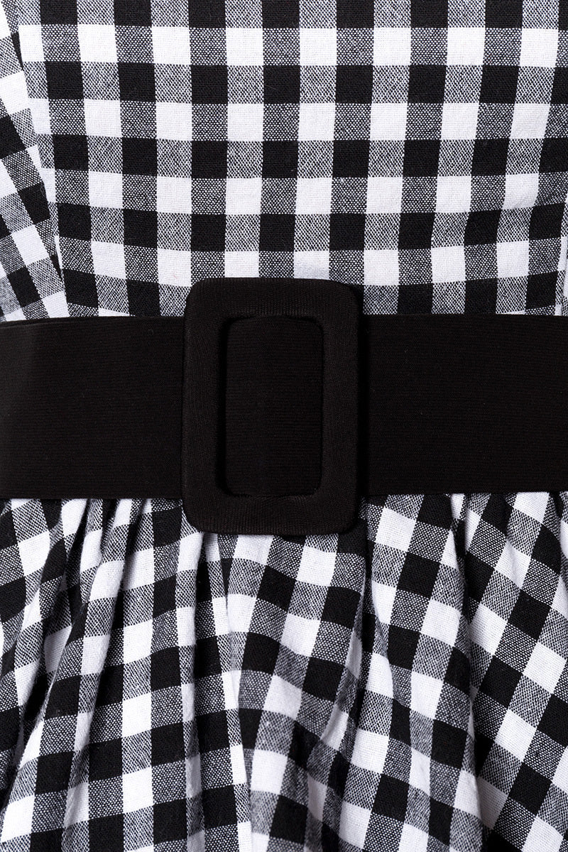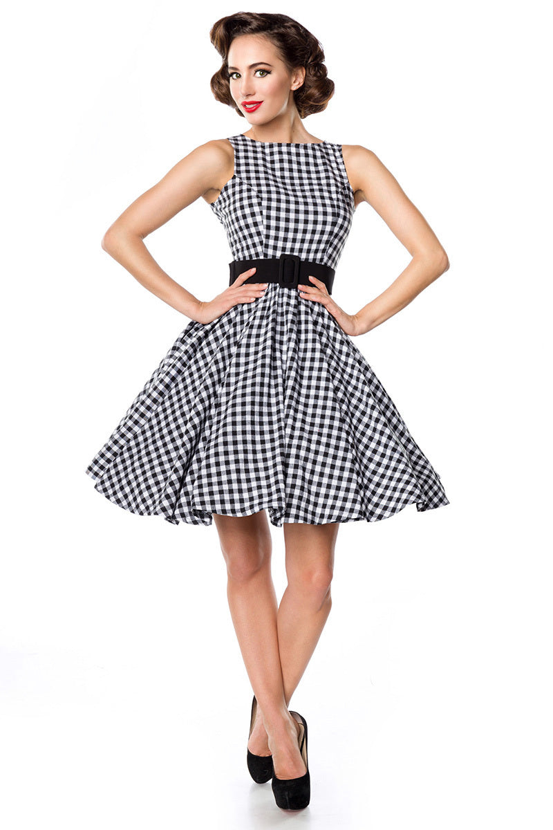 Flirty and feminine style thanks to its round neckline, sleeveless circle skirt and belt for an elegant feminine fifties silhouette.