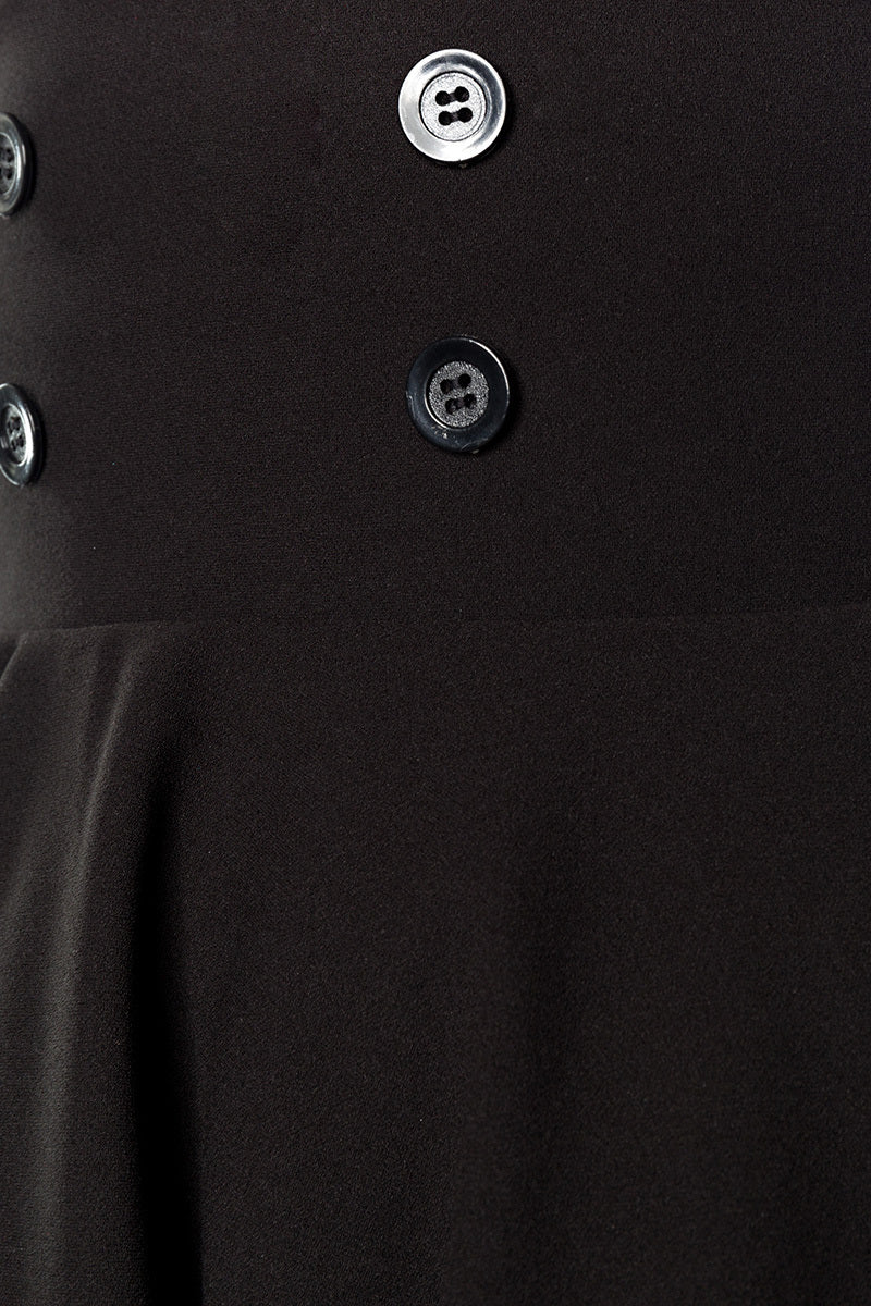 This high-waisted skirt has an extra wide waistband with decorative buttons.