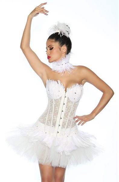 This charming corset is a dream made of lace, feathers and sparkling stones.