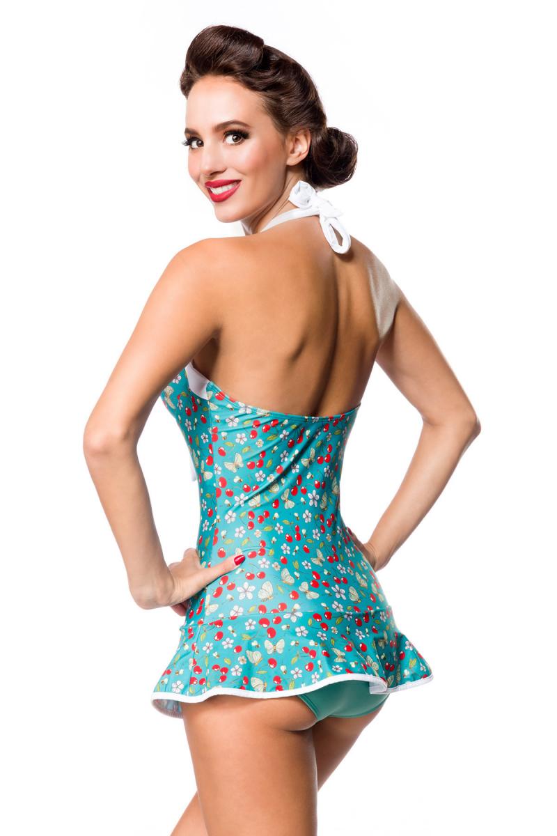 Dit vintage geïnspireerde halter badpak jurk is voorzien van beugelcups bh met uitlopende rok.