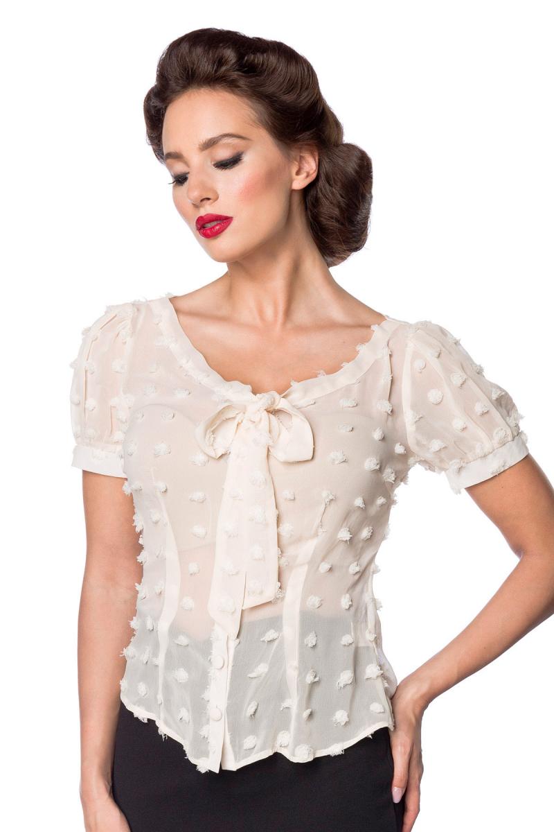 Blouse in jaren ’40 model met korte pofmouwtjes, sluit met een rij van stoffen knoopjes, wijde rond-hals met strikbanden.